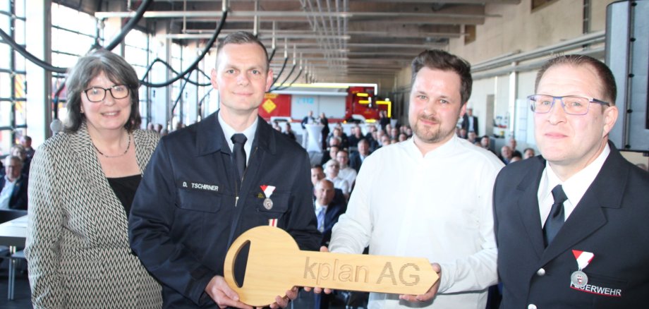 Zum Abschluss des offiziellen Teils überreichte Architekt Ronald Schmidt von der Firma kPlan aus Siegen im Namen aller Planer den symbolischen Schlüssel an Bürgermeisterin Barbara Eckes, Stadtbrandinspektor Martin Trost und Wehrführer David Tschirner. Der hölzerne Schlüssel solle für Nachhaltigkeit, Wachstum und Zuversicht stehen.